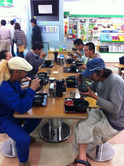 行きのサービスエリアにて、皆で牛タン丼を食べる